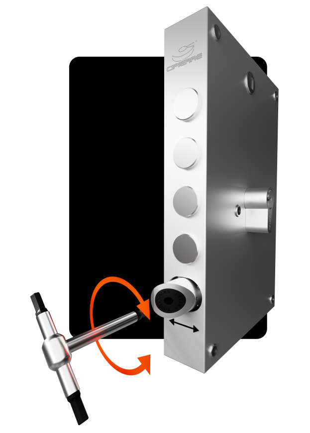 La rotazione della chiave a brugola determina lo spostamento laterale dello scrocco per eliminare il gioco eccessivo dell’anta o, al contrario, per eliminare l’esagerato sforzo per azionare lo scrocco dovuto, per esempio, alla guarnizione.