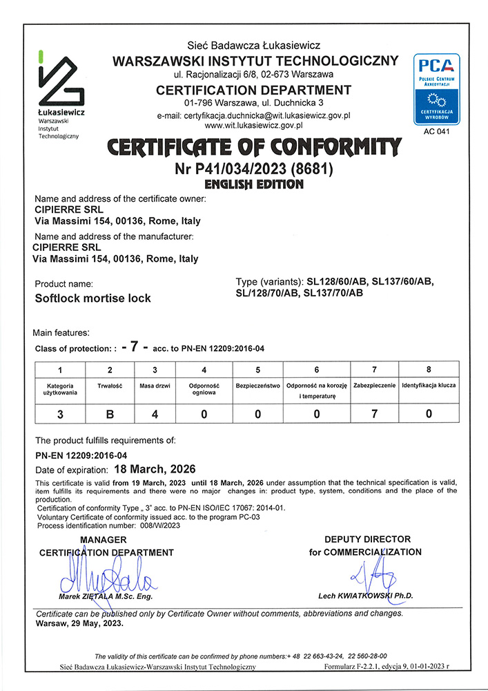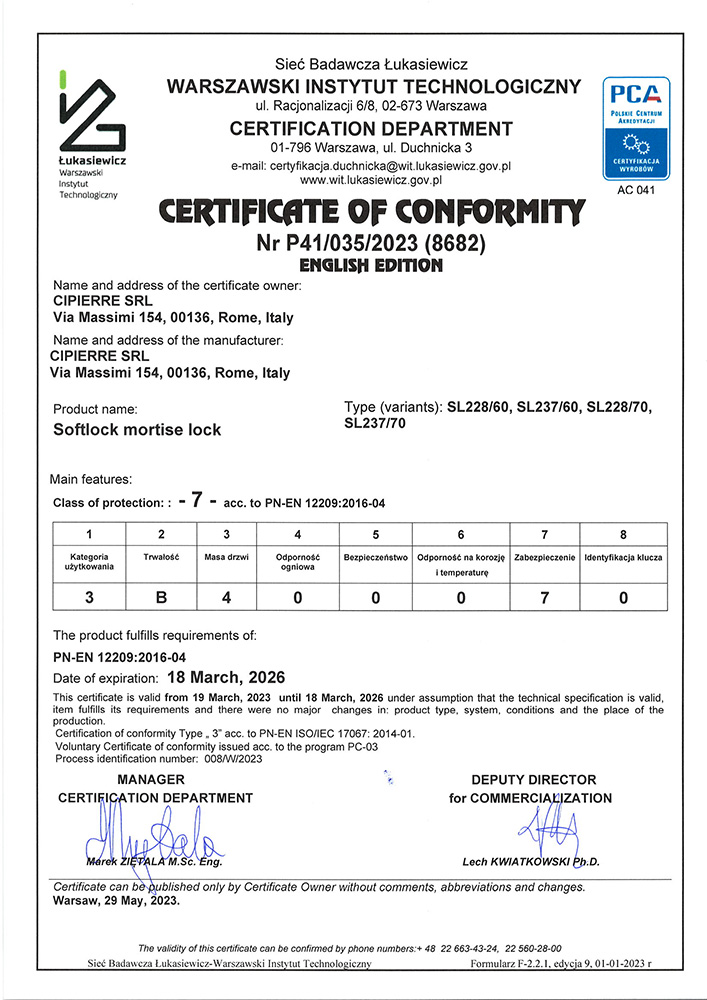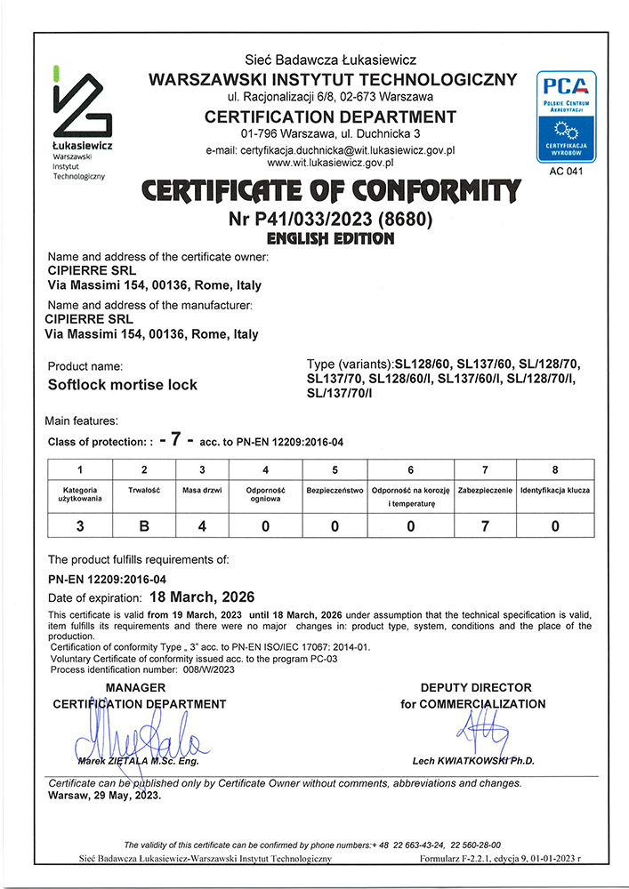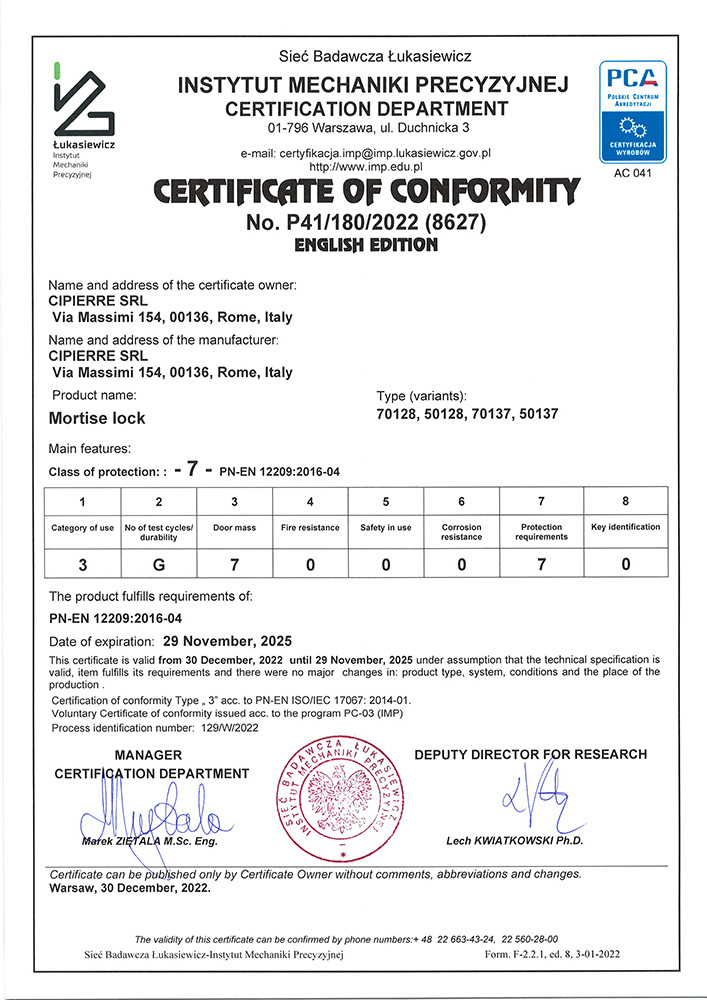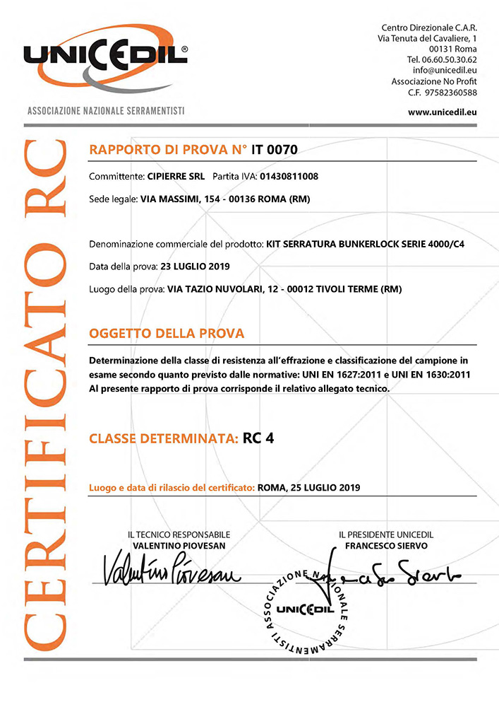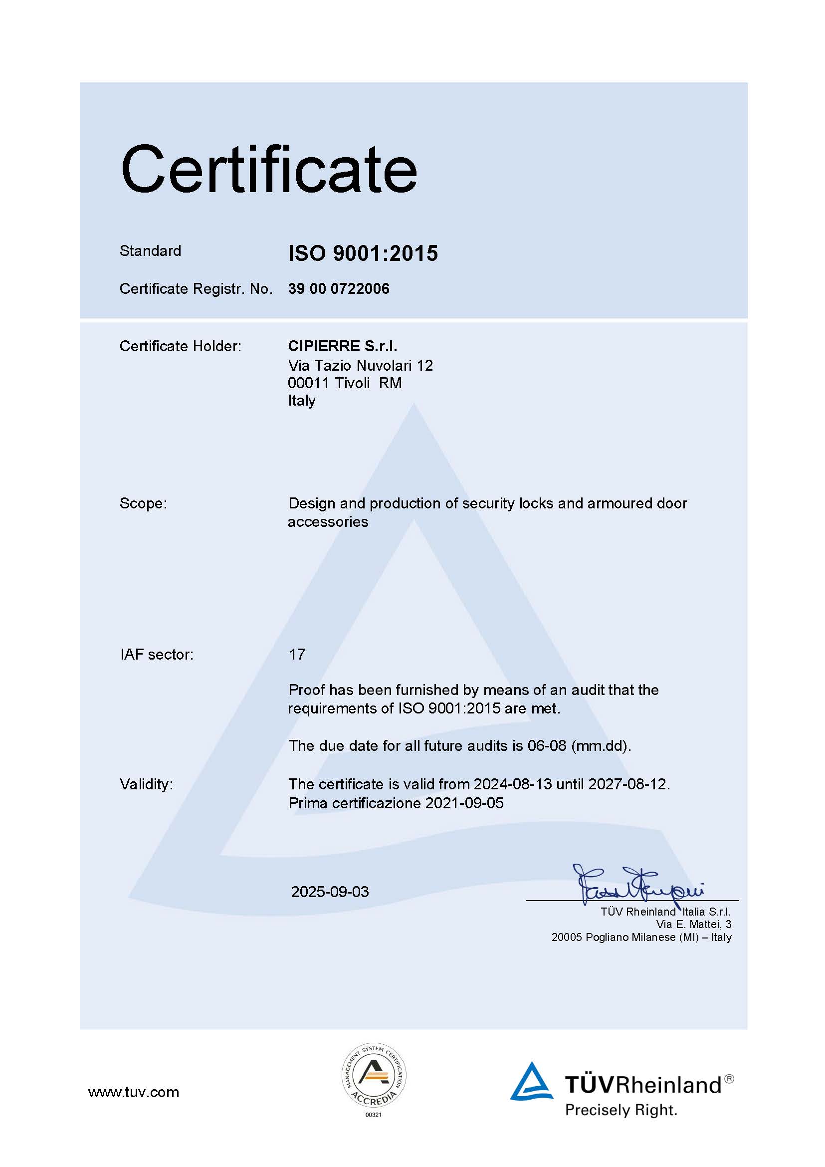 CIPIERRE сертифицирована TÜV RHEINLAND, одним из наиболее аккредитованных европейских институтов сертификации. В двух производственных цехах гарантируется применение системы управления в соответствии со стандартами EN ISO 9001: 2015 для проектирования и производства компонентов и аксессуаров для бронированных дверей и замков.