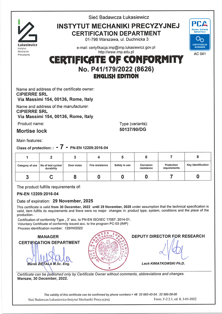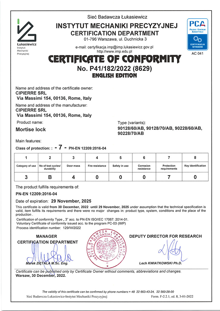 Там, где это применимо, продукция Cipierre была сертифицирована IMP в соответствии с европейскими правилами для подтверждения уровня долговечности, прочности и функциональности.