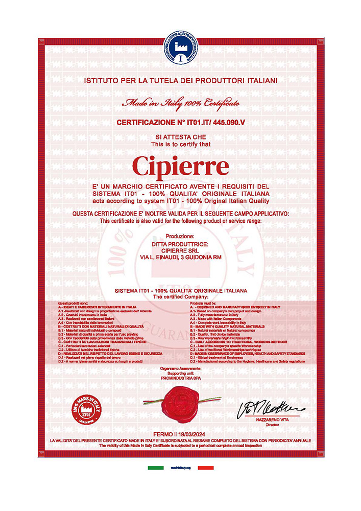 Этот сертификат выдан Институтом Защиты Итальянских Производителей и гарантирует качество и прозрачность Cipierre в производстве своей продукции в Италии, используя эксклюзивное проектирование и дизайн, а также пользуясь только высококачественными материалами.
